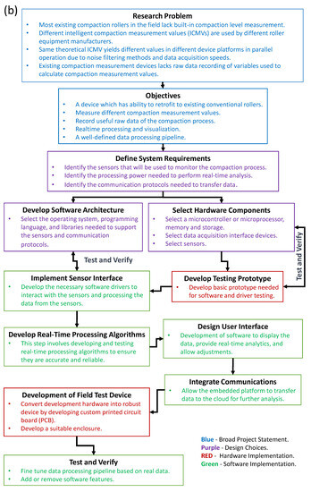 The design vision for the intelligent compaction analyzer device, as outlined in Figure 1, was conceived to bridge these gaps. This device is innovatively designed to retrofit onto conventional rollers, offering capabilities to measure varying compaction values, record essential raw data during the compaction process, and facilitate real-time processing along with visualization through a well-structured data processing pipeline. The design process began with defining system requirements, including selecting requisite sensors, computational power for real-time analysis, and essential communication protocols. Subsequent steps, all detailed in Figure 1, entailed the meticulous development of the software architecture, the choice of hardware components, the crafting of the sensor interface, and the formulation of reliable real-time processing algorithms. The user interface was designed for intuitive interaction, and communication capabilities were integrated, allowing the device to relay data to the cloud for deeper analysis. The design journey reached its apex with the transformation of development hardware into a robust, field-ready device, complete with a custom printed circuit board (PCB) and a sturdy enclosure. Rigorous testing and verification procedures ensured the refinement of the data processing pipeline and potential software feature adjustments.