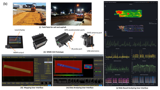 (a) Hardware architecture of the ICA platform. (b-i) Field testing of the ICA platform for initial data validation. (b-ii) Prototype of the ICA platform (Version 0.4). The IEPE accelerometer ports connect accelerometers, which capture vertical and horizontal accelerations. The IR probe port connects a non-contact IR temperature sensor. (b-iii) Mapping user interface, which controls the data acquisition process that provides a real-time map of the compaction material layer with instantaneous values of roller speed, frequency, amplitude, and surface temperature of the asphalt layer for a selected ICMV parameter. (b-iv) Data analyzing user interface that is used to view data records along with the final compaction map. The details of the other user interfaces are provided in the Supplementary Materials. (b-v) Web-based analytic interface powered by Amazon web services (AWS) Grafana.