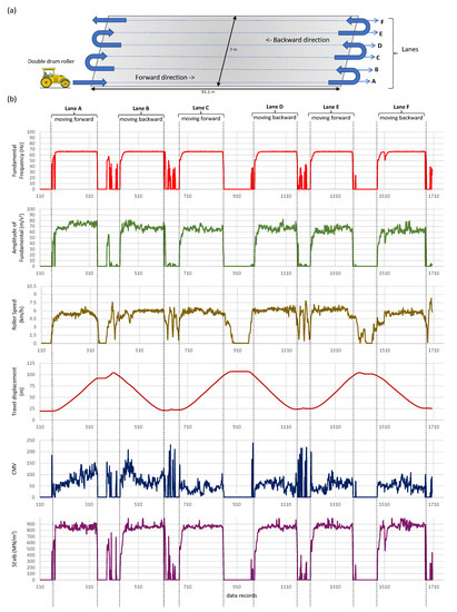 Illustration (a) schematically shows the roller compaction pattern in an actual road construction project. Each lane (A, B, C, D, E, and F) has about 33% overlap. Plots in (b) show the data envelope for the main parameters concerning the roller compaction pattern in (a). and are defined in Equations (22) and (27), respectively.
