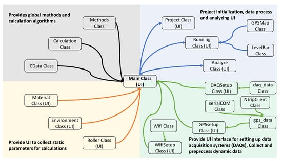 The software of ICA platform was developed to be lightweight and embedded platform friendly [54,55]. The UI was developed using , which has the lesser general public license (LGPL) python module of Qt framework [56]. All other programming library dependencies are shown in Table A1 in the appendix. ICA software consists of 20 classes, of which 9 are UI classes, as shown in Figure 6. The main class inherits from the class and has instances of all other UI classes. Project class, running class, analyze class, DAQ class, GPSsetup class, WifiSetup class, roller class, environment class, and material class inherit from class of . These UI classes share information with each other by calling the class instances through the main class. Figure 2b(iii,iv) shows the visualization of main user interfaces.
