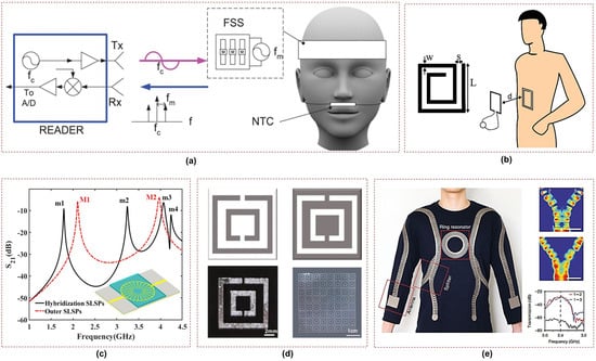 Metamaterial–based sensors: (a) modulated FSS respiratory sensor, reprinted with permission from ref. [40]. 2017, IEEE; (b) spiral resonator tag respiratory sensor, reprinted with permission from ref. [41]. 2022, IEEE; (c) typical surface plasmon resonator sensor [42]; (d) liquid metal–based flexible FSS [43]; (e) textile–based flexible metamaterial, reprinted with permission from ref. [44]. 2019, Springer Nature.