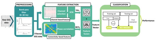 Overview of the proposed MI-BCI signal processing framework. Preprocessing: the raw EEG data are filtered using a band-pass filter (cutoff frequencies: 8–30 Hz). Feature extraction: the channel-based features are extracted using the SCN on a subset of EEG channels, as shown in the upper part of the figure. The lower part of the figure illustrates the extraction of BCFs computed by applying PC. Classification: the merged TIFs and BCFs are classified by a multiclass SVM classifier.