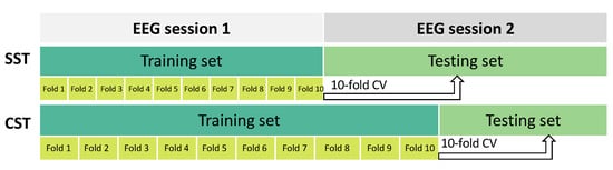 - Session-to-session transfer (SST): Session 1 of the EEG recordings was used as the training set and session 2 as the testing set [35,52].