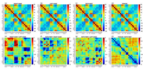 Functional connectivity matrices calculated using the PC method. The was computed for each matrix associated with a single epoch, and then the average across epochs was calculated. Upper part: grand average PC across subjects and epochs for each MI task ((a) RH, (b) LH, (c) F, and (d) T). Lower part: difference between the average PC across subjects and epochs for specific MI tasks ((e) RH–LH, (f) F–RH, (g) F–LH, and (h) T–F).