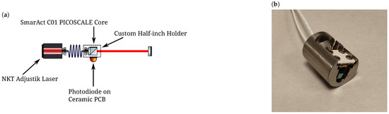 Figure 1. Schematic (a) and photo (b) of the custom-designed sensing head manufactured by SmarAct that is used throughout this work. The sensing head is embedded within the same readout structure as shown in Figure 1 of Ref. [8].