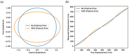 We define a quantity, i.e., the elliptical error ( δ ) expressed as the fractional difference between the semimajor and semiminor axes such that the semimajor axis is expressed as a = ( 1 + δ ) b for a semiminor axis of size b. The visual effect of the elliptical error on the Lissajous shape is shown in Figure 2a, with the corresponding periodic error on the displacement readout shown in Figure 2b. Through a Taylor expansion in δ (we can assume that in all reasonable scenarios, δ 1 ), we find that the phase estimator ( ϕ ¯ ) is related to the true arm phase approximately through