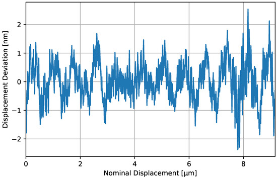 We sweep over the effective displacement by slowly actuating on the laser wavelength. A benefit of this method is that the modulation index does not change, as it would if the sweep were performed over true displacement, introducing the nonlinearity associated with a dynamically changing Lissajous figure due to a non-constant modulation index. This is achieved by setting the laser wavelength from one extreme to another (sweeping over a total wavelength span of 0.9 nm) and allowing the built-in temperature servo to shift the wavelength to the new set point. We isolate a region containing approximately 10 fringes in the middle of the sweep where the wavelength was swept through approximately linearly in time. We linearise the readout using an elliptical fit in post processing, then remove the underlying, slowly varying nonlinearity of the sweep using a ninth-order polynomial fit. As the period of the sensor nonlinearities is much shorter than any trend in the sweep, we can remove these trends without also fitting to the periodic error. The result presented in Figure 3 shows the deviation of the measured displacement signal from the fitted ‘nominal’ displacement over the swept region. The nominal displacement is given by the estimated true phase (calibrated for displacement) covered over the wavelength sweep, which is derived from the ninth-order polynomial fit to the time series.