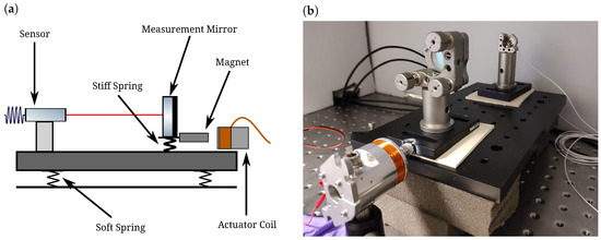 Figure 4. Adjusted layout of the experimental setup originally shown in Figure 1 of Ref. [8]. (a) Arrangement of the sensor, mirror, and actuator, as well as the effective springs formed by the foam blocks and rubber pads. (b) Photo of the setup inside an acoustically isolating box.