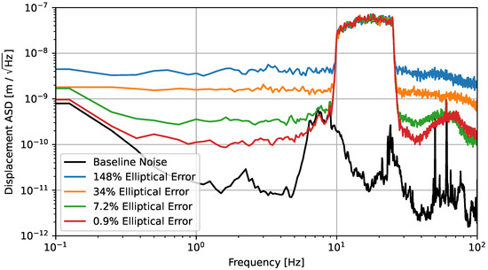 Figure 5. Comparison between measured and simulated nonlinearities during a controlled and tightly band-limited injection of displacement noise using a coil-magnet actuator. The simulated spectra show good agreement with measurement for high values of elliptical error, which supports the analysis present in Section 2.3. At the smallest value of elliptical error, the measured nonlinear noise is within a factor of three above the simulation, which can be attributed to the presence of other nonlinearities, particularly the nonelliptical nonlinearity laid out in Section 2.4 and the residual nonlinearity of the coil-magnet drive. The baseline noise curve shows the sum of all measured noises in the quiet (‘zero-displacement’) state and represents the absolute noise floor of the sensor. This sensitivity is significantly above the noise performance we demonstrated in Ref. [8], but this can be explained by three main factors: (i) the setup only includes a single sensor, meaning there is no frequency stabilisation; (ii) the box is not as well insulated with packing foam, meaning air currents are not as suppressed; and (iii) the rubber pad necessary to enable differential driving of the mirror and sensor also breaks the common mode rejection of seismic noise present in the original null measurement.