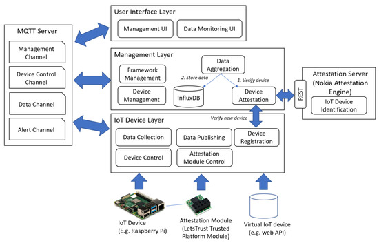 The proposed IoT security framework aims to enable the rapid and simplified development of sensor-driven IoT systems by orchestrating the work related to sensor data aggregation, monitoring, and attestation. The programmer can focus on adapting the framework for their needs and extending it to add more features. The IoTAttest framework loosely coupled, layered architecture is depicted in Figure 1: (i) The IoT Device Layer connects to various IoT devices, thus mediating commands and data between the devices and the Management Layer; (ii) the Management Layer includes services for overall framework management, device management, device attestation, and data aggregation; and (iii) the User Interface Layer provides tools for the user to access the framework management and data monitoring functionalities. The framework layers communicate with each other using a Message Queue Telemetry Transport (MQTT) server [43]. Moreover, the management layer communicates with an instance of an attestation server (e.g., Nokia Attestation Engine) by Representational State Transfer (REST). In the following sections, we explain each part of the framework in detail.