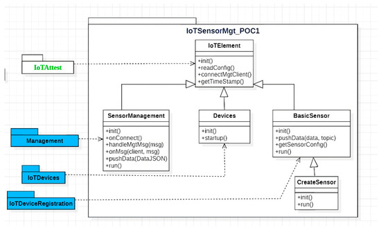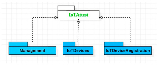 A package diagram of the framework’s core components is presented in Figure 2. All components in the packages are configured using JSON-based configuration files, which define, for instance, available IoT devices as well as connectivity configuration to the MQTT server and attestation server. The Management package handles overall device management and uses attestation and aggregation libraries for managing sensor device validation and data aggregation, respectively.