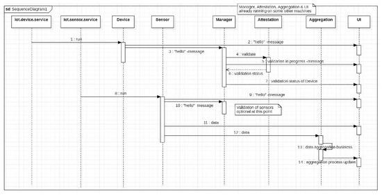 The overall goal of the first PoC application, a management system for IoT sensor devices, was to create some sensor information flows and display them on a dashboard. Figure 3 depicts the architecture of the application whereas the sequence diagram of the system operation is visualized in Figure 4. The sensor management system was built with user interfaces for viewing the status of sensor devices and the data sent by them. Each IoT sensor device was equipped with a TPM component that was used for attestation. Moreover, the devices communicated with the Management Layer using MQTT channels. The sensors implemented in the PoC were humidity, infrared, and time of flight.