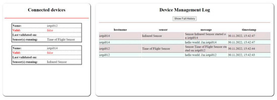The sensor management system is open to extension with different types of IoT sensor devices. New IoT sensor devices are first registered with the MQTT server, and the subscribed UI elements may subsequently publish the data retrieved from the sensors. A sample of the device management log file is presented in Figure 5 (right). The Node.js listens to the MQTT messages and sends the data to the respective clients through WebSocket, after which the JavaScript-based Pug template engine is used to visualize the data in HTML.