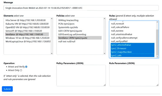 The system implementation consists of devices and sensors, attestation management (Figure 6), and management UI. The software used to implement the system comprise Python 3, Vim, MQTT, Flask, and IoT device firmware. User interfaces are based on HTML, CSS, JavaScript, Pug, WebSocket, and Node.js.
