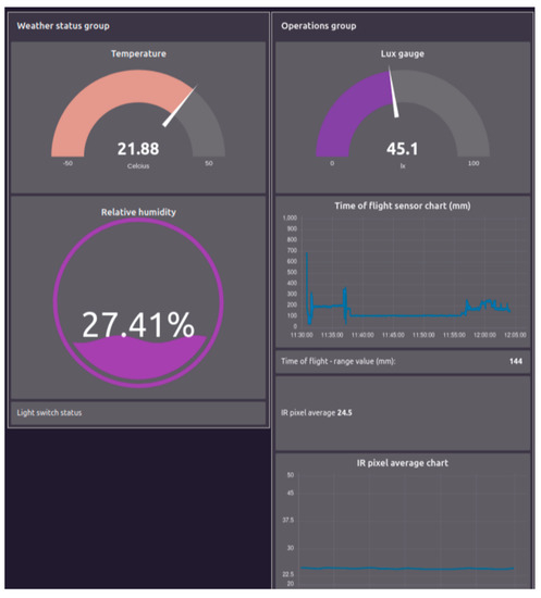 Additionally, the data collected using the sensors are visually presented with the help of Node-RED, as depicted in Figure 7. The figure displays temperature, humidity, and illumination measurements, along with the time-of-flight sensor data that indicate the distances, and the IR pixel value displaying the average of the apparent temperatures of the infrared camera pixels.