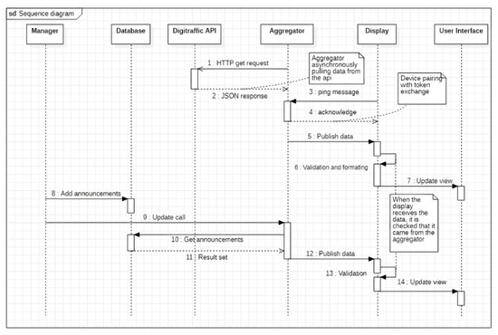 The diagram presented in Figure 9 shows a sequence of events demonstrating the interaction between various entities within the system. The system consists of six main components: display, manager, aggregator, MQTT communication protocol, data validation module such as TPM or SSL/TSL, and Digitraffic open data API for train schedules.