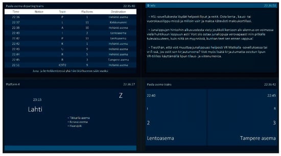 Sample of main displays and customized displays: the main monitor listing departing trains at Pasila station (top-left), a monitor providing customized information about purchasing tickets (top-right), a monitor presenting customized information about commuting to the city of Lahti (bottom-left), and a monitor showing customized information on a specific platform for trains to the airport (Lentoasema) and the city of Tampere.