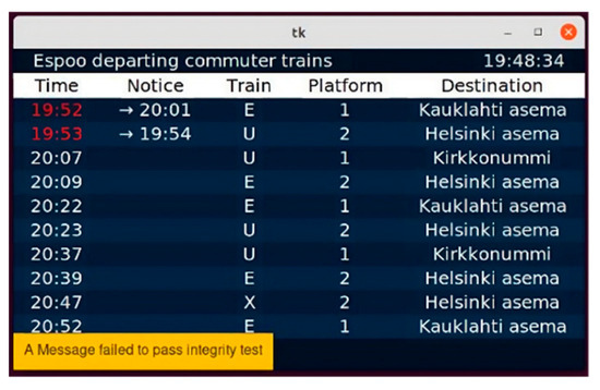 Validation and the integrity of data transmitted over the system were key features of the IoT framework. Since the communication between MQTT, aggregator modules, and displays is ensured, the use of TPM is recommended to secure the messages between different entities. In this project, the developers worked remotely using a virtual development environment, and the TPM only worked as a physical device; therefore, using the TPM was inconvenient for the PoC development. Therefore, the project team applied the OpenSSL digital signature to mimic a TPM. Hence, a digital signature is added to the train traffic data sent by the aggregator program to authenticate them. The authentication takes place when the device receives a record from the MQTT channel, the encrypted content of the signature is opened, and an X509 certificate is issued, which contains the public key from the previously obtained pairing. The signature is then compared with the content of the message. If they match, we can verify the integrity of the received data. Figure 11 shows an example of a failure message. We can check the validation by capturing the record from the topic channel, falsifying its content, and sending the information directly to the MQTT topic channel subscribed to by the display. The result is that the display detects a problem in the integrity of the message and automatically discards the information.