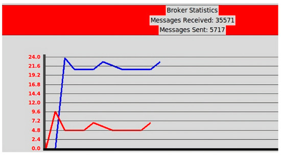 Sample of the aggregator user interface (MQTT broker statistics). The blue and red lines indicate the sent and received messages, respectively.