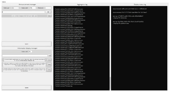 The aggregator obtains data from Digitraffic through an HTTP request, which results in the retrieval of a JSON file as a response. This operation is carried out asynchronously, leading to the publication of data regardless of whether any display is active or not. Subsequently, the display is triggered to commence its operation by a ping request to the sender or client that contains a public key. This key is employed to facilitate the identification of the display by the aggregator. After receiving a message, the aggregator sends a response with its public key as a confirmation. Afterward, the aggregator shares the collected train data in their respective topics on the MQTT server. The display confirms that the data originate from the data aggregator and are not from an external source. Then, the data are formatted in a way that the user interface can show them. As the formatted data are received, the user interface updates its display accordingly. A sample of the customized content for a specific display is presented in Figure 10, which depicts four displays showing standard or customized information.