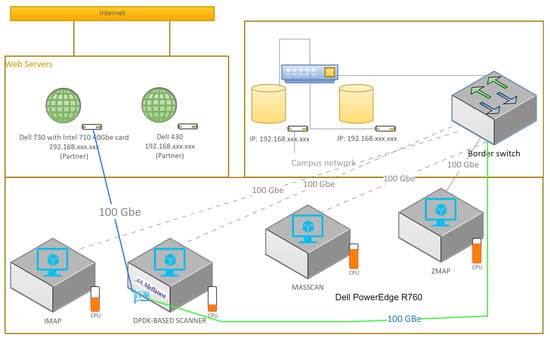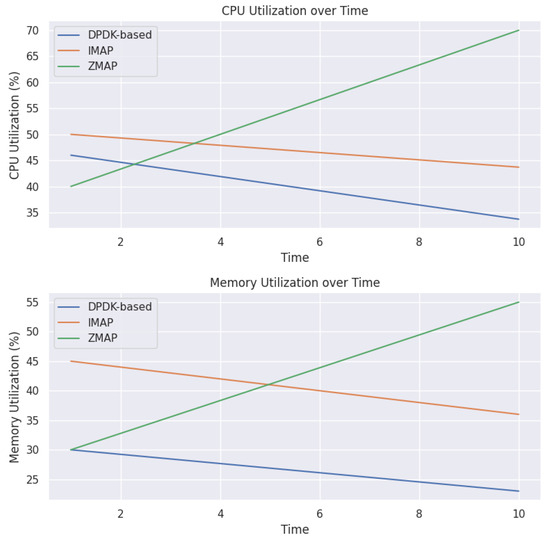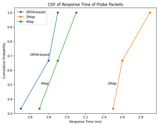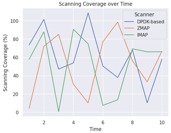 We also measured each scanner’s CPU and memory usage during the experiment. The DPDK-based scanner utilized 50% of the CPU (eight cores) and 50 MB of memory, while Nmap utilized 100% of the CPU (eight cores) and 200 MB of memory. This indicates that the DPDK-based scanner is more efficient regarding CPU and memory usage than Nmap.
