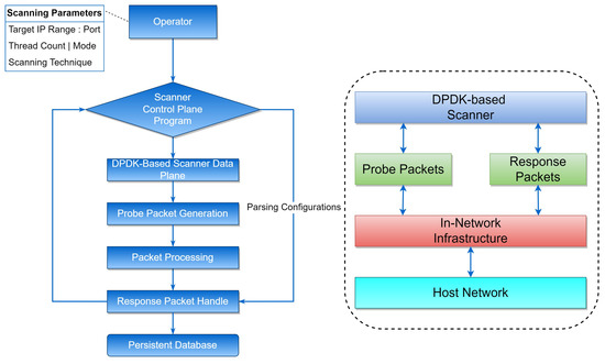 In this section, we present the architecture and implementation details of our DPDK-based scanner, elucidating how it leverages the Data Plane Development Kit (DPDK) and smart network interface cards (NICs) to achieve efficient packet processing and significantly improved scanning performance. Moreover, we elaborate on the advanced techniques integrated into the scanner, including protocol-specific probes and evasive scan techniques, which enhance network visibility and security.