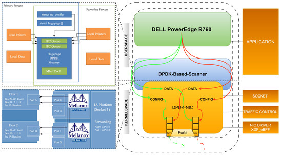 In this section, we present our proposed DPDK-based network scanner, designed to address the limitations of existing network scanning techniques. The scanner leverages the Data Plane Development Kit (DPDK) framework and employs advanced, efficient, high-speed network scanning techniques. The flow diagram and design of the DPDK-based scanner is presented in Figure 3, and the detailed architecture and functionality of the DPDK-based network scanner are presented in Figure 4. An algorithm for a DPDK-based scanner is presented in Algorithm 1. The algorithm works by initializing DPDK, creating packet buffer pools, initializing the NIC with DPDK, and creating receive and transmit queues. It also creates and configures packet filters, initializes memory pools for packet headers and data, and allocates memory for the list of open ports for each target IP address. It then sets up DPDK lcore affinity and generates TCP SYN packets with target IP addresses and random source ports. These packets are enqueued in the transmit queue. The algorithm then starts the DPDK packet processing loop and continues to parse incoming packets. If a packet is a TCP SYN-ACK response, it updates the list of open ports for the corresponding target IP address. Once all packets have been received, the DPDK packet processing loop stops, and the algorithm returns the list of open ports for each target IP address.