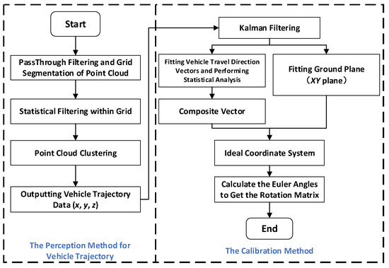 The paper presents a calibration method for addressing angle deviations in roadside LiDAR. Its application scenario is depicted in Figure 4, utilizing traffic elements (road heading direction and ground surface) as reference objects. The objective is to improve the accuracy of vehicle position detection and facilitate subsequent data processing and analysis. This section provides a detailed introduction to the basic principles of this calibration method, with Figure 5 illustrating the basic algorithm flow of the point cloud calibration method. As the methods for vehicle trajectory perception using LiDAR are already well developed, this section primarily focuses on introducing the calibration method as the main content.