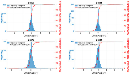 The vehicle’s driving direction, based on LiDAR perception, is a crucial reference for calculating the projection of the road’s forward direction onto the coordinate system of the LiDAR system. This paper presents a statistical analysis of the angles between the perceived vehicle driving directions and the road heading directions based on four sets of measured LiDAR data. The LiDAR used in the experiments has been calibrated for angles using fixed reference markers, aligning the X-axis of the system’s coordinate system parallel to the road heading direction. The perception range was set as a 12 m segment, with 6 m in front and 6 m behind the LiDAR, as depicted in Figure 6. The statistical results are shown in Figure 7 and Figure 8.