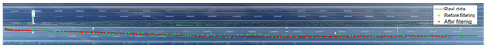 Taking the driving trajectory of a vehicle with lane-changing behavior from the highD dataset [25] as an example, the effectiveness of the KF was tested by introducing some noise, as shown in Figure 9. It can be observed that the trajectory was optimized to a certain extent. Although the test was conducted using two-dimensional vehicle trajectories, the KF can also be applied to optimize three-dimensional vehicle driving trajectories [26].