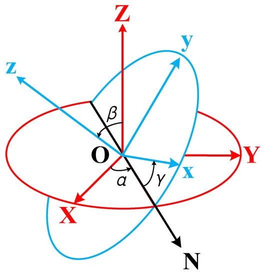 Euler angles are used to describe the rotational orientation of an object in three-dimensional Euclidean space [29]. They consist of three rotation angles, typically denoted by symbols . Each angle represents the amount of rotation around a specific axis. Referring to Figure 10, xyz represents the reference axes of the reference frame, and XYZ represents the object’s own coordinate axes. The intersection line of the xy plane and the XY plane is denoted by N. For a zxz intrinsic Euler angle convention, the angles can be statically defined as follows: (precession angle) is the angle between the X-axis and N, (nutation angle) is the angle between the z-axis and Z-axis, and (spin angle) is the angle between N and the x-axis. The reference frame composed of xyz (fixed frame) is also known as the laboratory reference frame, which remains stationary. On the other hand, the coordinate system composed of XYZ (body-fixed frame) is fixed to the object and rotates with the object during its rotation.
