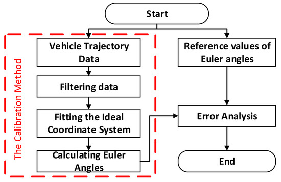 The roadside perception system in the experiment involved mounting an uncalibrated LiDAR system at a height of 3 m on the side of a highway. The system continuously collected data for approximately 15 min, capturing trajectory information for nearly 1200 vehicles. Subsequently, the researchers used fixed reference markers for measurements to calculate the offset angle of the LiDAR system. This allowed them to determine the transformation relationship between the LiDAR system coordinate system and the ideal coordinate system, expressed as zxz Euler angles: , , and . These data were used to validate the accuracy of the proposed LiDAR point cloud angle calibration method. To provide a clear description of the validation process, this paper includes a validation algorithm flowchart for the LiDAR angle calibration method, as shown in Figure 11. The flowchart illustrates the steps and computations involved in the validation process, ensuring the accuracy of the calibration method.