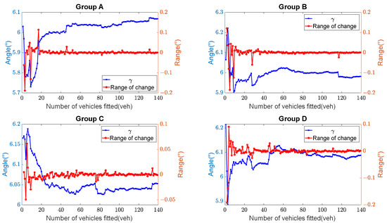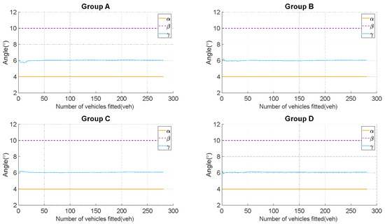 This paper validates the proposed calibration method for the LiDAR system. Based on the collected vehicle trajectory data, vehicle trajectories within a 10-m range before and after the LiDAR deployment locations are selected. The trajectory data is categorized into four experimental groups based on the vehicle IDs, with lower ID numbers being assigned to vehicles that entered the recording area earlier. These experimental groups are specifically labeled as Group A, Group B, Group C, and Group D in accordance with academic conventions. The partial calculation results for are shown in Table 2, and the summarized results of all calculations are presented in Figure 12.