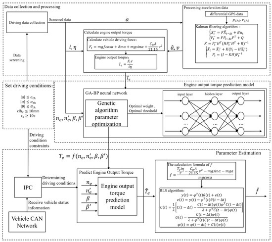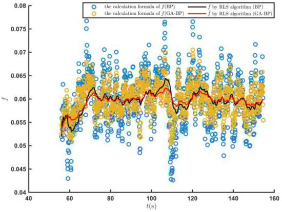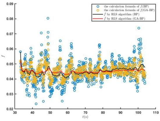 The root mean square error of the engine output torque obtained by the engine output torque prediction model established by the BP neural network was 78.65, and the coefficient of determination was 0.768. The root mean square error of the engine output torque calculated by the GA–BP was 45.06, and the coefficient of determination was 0.924, which was 42.71% and 20.31% higher than those of the BP neural network, respectively. Figure 14 shows the result on the further estimation by the RLS algorithm. The rolling resistance coefficient estimated by the GA–BP neural network method was more convergent. The average error of the value estimated by the RLS algorithm was 0.00093, while it was 0.00117 for the BP neural network. Thus, the estimation accuracy was improved by .