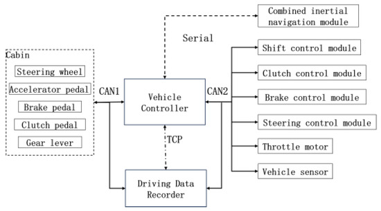 The tracked vehicle examined in this study was equipped with a diesel engine, a dry clutch, and a fixed shaft gearbox. The tracked vehicle was equipped with a combined inertial navigation module, including an acceleration sensor and a gyroscope. The positioning data were processed by differential processing, and the accuracy reached the centimeter level. The acceleration sensor was used to measure the longitudinal acceleration value of the tracked vehicle in real time. The gyroscope was used to measure the vehicle pitch angle, and the vehicle pitch angle was assumed to be equal to the road slope value. The vehicle controller received the driver’s control instructions to control the vehicle, and the driving data recorder recorded the vehicle’s driving data, which was convenient for the data analysis and control optimization of the vehicle. The communication structure of each module is shown in Figure 3.