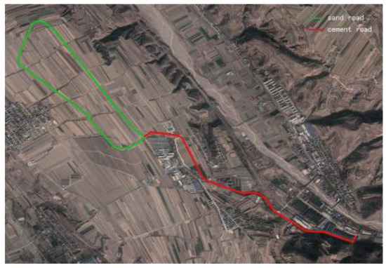 The test site was a vehicle driving test site in Shanxi, China. The total length of the test site route was 10 km, including a sand road and a cement road. The rolling resistance coefficients of the two roads were measured to be 0.06 and 0.045. Figure 4 shows the satellite map of the experimental site. A total of 119.67 driving data were collected by the driving data recorder. The collected data included GPS coordinates, vehicle speed, longitudinal acceleration, pitch angle, heading angle, and gear and clutch displacement.