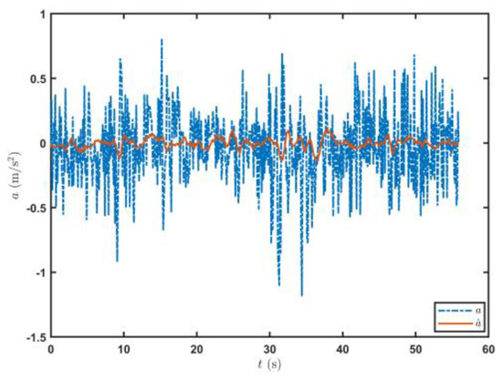 In these formulas, is the prior state estimation at time , is the posterior state estimation at time , is the prior covariance matrix at time , is the covariance matrix at time , is the process noise covariance matrix, is the observation noise covariance matrix, and is the Kalman gain coefficient. In this study, , , and . The acceleration data measured by some accelerometers are filtered, and the filtering effect is shown in Figure 5.