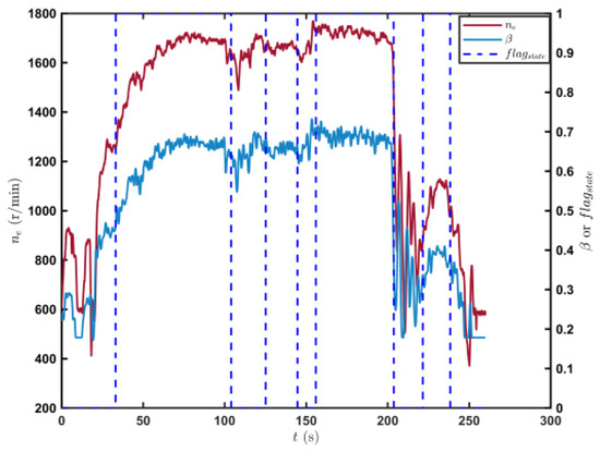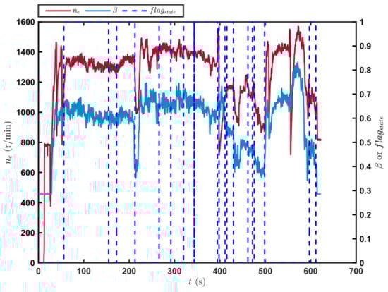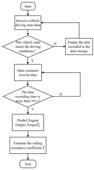 The IPC received the vehicle state in real time through the controller area networks (CAN) bus. When the vehicle state was determined to meet the set working conditions, a data storage container was established to store the vehicle state data. When it was determined that the current vehicle driving state did not meet the set conditions, the data stored in the container were emptied and the vehicle state was continuously monitored. When the container stored data for more than 10 , i.e., the vehicle had been running in a specific state for 10 , the engine output torque prediction model began to predict the based on the and , and the was further estimated. The data container was used to store data to estimate the and update the in real time, based on the current vehicle state. The process through which the IPC processed the tracked vehicle driving data is shown in Figure 8.