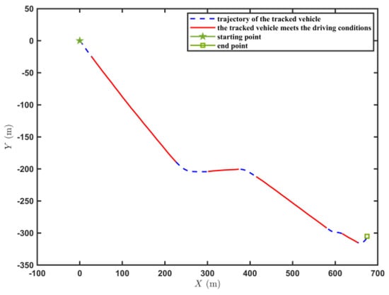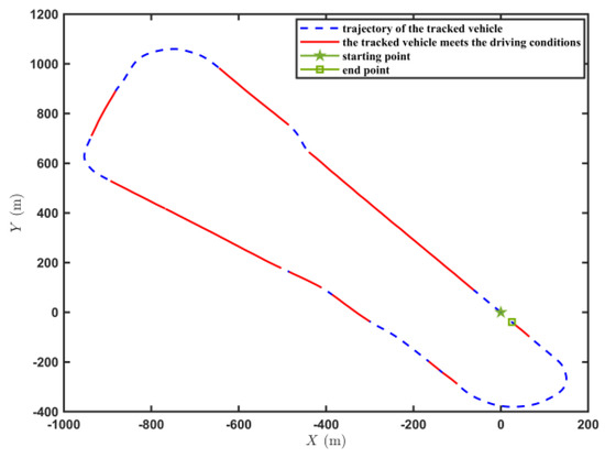 - It was necessary to limit the heading angle in the screened vehicle driving data to ensure that the tracked vehicle was in a straight-line driving state. Considering the influence of sensor measurement error and random road disturbances, we set . In the selected driving data, the change in the heading angle of the vehicle between the initial moment and the final moment could not exceed .