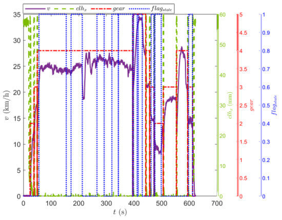 - The selected vehicle driving data did not include the clutch separation process, and the driving force during the vehicle driving process was only provided by the engine. The engagement and separation state of the clutch was judged by the displacement of the clutch control cylinder . When the clutch combination displacement , the clutch was considered engaged. Setting the vehicle acceleration threshold and the minimum stable driving time threshold ensured that the stable driving data were screened after the vehicle shift was complete. By analyzing the driving data, we set and . The driving data when the vehicle acceleration for more than 10 s after the clutch was engaged was considered stable and valid data.