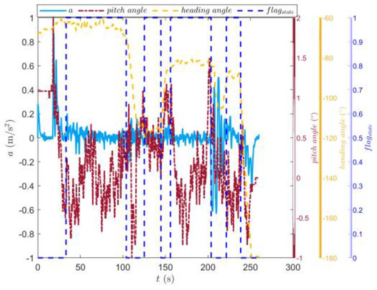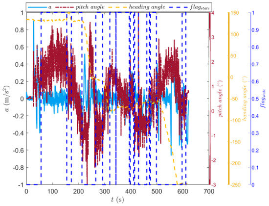 - The measurement of the vehicle pitch angle by the gyroscope was affected not only by the road slope but also by installation error, the suspension state, and other factors. Under some conditions, for example, the clutch was engaged too fast when shifting, which caused the vehicle to pitch in a short time even if it was driving on a flat road, resulting in measurement errors. At the same time, a large change in the road slope also increased the measurement error of the acceleration sensor. To improve the prediction accuracy of the model, the driving data with a large angle measured by the gyroscope were eliminated by setting the ramp threshold to , so that the tracked vehicle could drive on a flat road, which was approximately level, as far as possible.