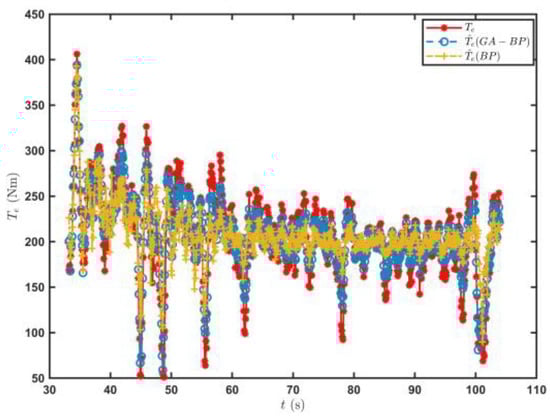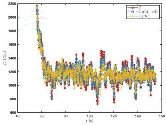 Figure 13 shows the prediction of the engine output torque prediction model when the tracked vehicle satisfied the driving conditions for the first time on the sand road. The , calculated based on using Equation (1), was the real value, and the engine output torque predictions of the BP neural network were used as the control data. The engine output torque value predicted by the GA–BP neural network was closer to the . The root mean square error and the coefficient of determination were used as the evaluation indices on the accuracy of the engine output torque estimation.