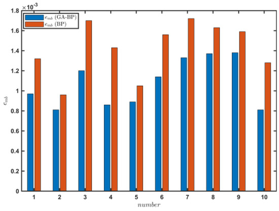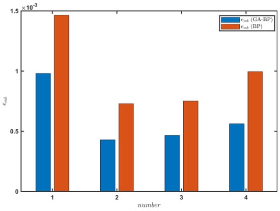 Table 3 shows the estimated values on the vehicle state, , and of the tracked vehicle on the cement road under the set conditions. The value in the results estimated by the GA–BP neural network was 13.09, and the value for the BP neural network method was greater. The from the GA–BP method was 0.895, which was 12.8 higher than that of the BP neural network. Figure 22 shows the change in the values for the estimation results obtained by the two methods. The value by the GA–BP neural network predictions was 0.00061, which was 38.1 higher than that of the BP neural network predictions.