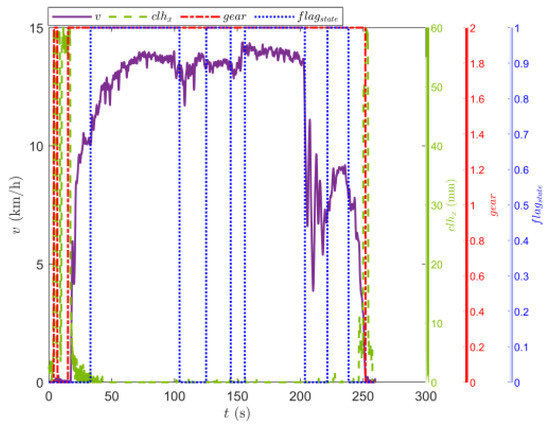 Figure 9 shows the trajectory of the tracked vehicle. The vehicle started from the starting point and traveled around the circular runway. The driving distance was 3694 . The red solid line section marked in Figure 9 indicates that the state of the tracked vehicle on this section satisfied the set driving conditions. The total length of the red solid line segment was 2054.5 . Figure 10 shows the change in the speed, and the gear and clutch cylinder displacement in the tracked vehicle during the whole driving process. As can be seen from Figure 10, the total driving time of the vehicle was 622.3 . The vehicle starts in second gear, the highest gear was fifth gear, the highest speed was 32.5 , the commonly used gear during the vehicle driving was fourth gear, and the average driving speed was 20.55 . When , the driving state of the vehicle meets the set conditions. The entire driving process satisfied the set driving conditions during 10 periods, and the total time was 313.8 . Figure 11 shows the changes in the acceleration, pitch angle, and heading angle of the tracked vehicle. It can be seen from Figure 11 that the acceleration of the vehicle increased rapidly in a short time during the engagement of the vehicle’s clutch, and the impact of shifting the vehicle was large. After the clutch engagement was completed, the vehicle acceleration changed relatively smoothly when the vehicle was accelerating and decelerating. The acceleration measurement value was more credible, and it was reasonable to screen the vehicle driving data by setting the acceleration threshold. It can be seen from the change in the heading angle that when the tracked vehicle was under the set driving conditions, the heading angle of the vehicle was almost unchanged, and the vehicle could be considered to have maintained, approximately, a straight driving state. Under the set driving conditions, the change in the pitch angle of the tracked vehicle was in the range of the set pitch angle. Figure 12 shows the changes in the engine speed and accelerator pedal angle during the driving process of the vehicle. The selected driving information data excluded the rapid variation stage of the engine speed during the shifting process. The accelerator pedal angle and engine speed varied smoothly, and the vehicle ran stably.