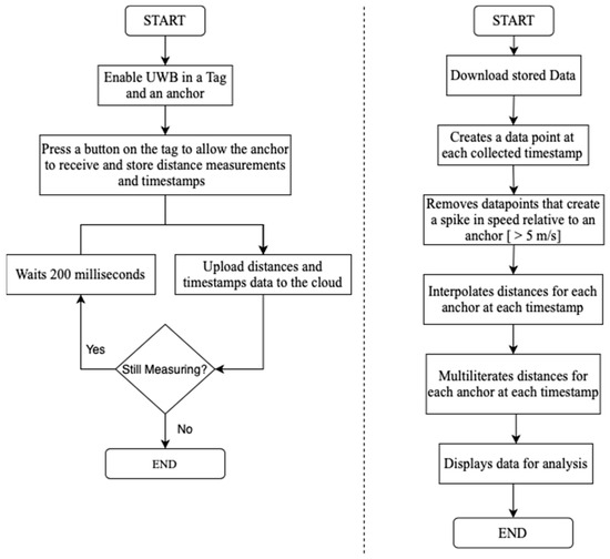 In general, the anchors can be placed at fixed locations, preferably in a grid pattern, by affixing them to a tripod or attaching them to a stable structure such as a wall, a ceiling, or a streetlight post. The UWB tags can be attached to a moving host, e.g., a vehicle or a pedestrian. Once the anchors and tags are secured in place, the UWB anchor exchanges signals with the tags. The range of the tag, measured relative to the anchor position, is calculated in terms of the signal’s time of flight. In this study, each anchor was affixed to a stable mounting device at a height of 0.91 m. Each anchor periodically communicated with the nearby tag to range the relative distance between them. This created a time sequence of distance measurements for each anchor-tag pair. This represented the data component registered at each anchor. In the early stages of the experiments, the distance data acquired by the tags were uploaded to cloud-based storage every 200 milliseconds. Specifically, this entailed selecting the most recent data gathered by the tag for each anchor and transmitting it to the cloud. This method was adopted because uploading data too often could result in a loss of data packets. In subsequent stages of the experiments, the data transmission was refined to aggregate detections into batches of 60 before uploading to the cloud. This modification allowed for a longer time between instances of uploading while maximizing the number of captured detections. Those data components were continuously updated as long as the UWB was enabled on both the anchor and the tag and provided that they were close enough to each other to successfully exchange the UWB signal. Once the UWB devices were disabled, the data analysis phase started. The stored data were downloaded as a structured text file in the format of JavaScript Object Notation (JSON).