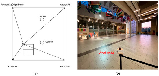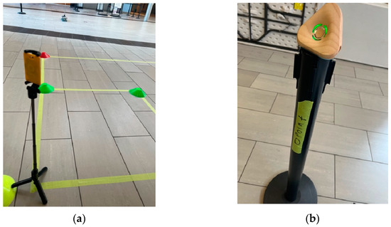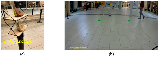 (a) A tag placed at one of the reference points; (b) A UWB anchor position.