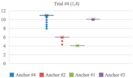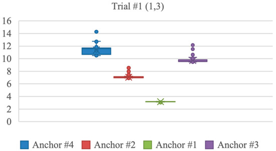 The x coordinate measurements had an average error of 0.03 m, excluding trials 1 and 4, where the error was notably higher, measuring 0.25 m and 0.22 m, respectively. The y coordinate measurements had an average error of 0.04 m across all trials. The distribution of the distances measured from the stationary tag to each anchor in trials 1 and 4 are shown in the following Figure 4 and Figure 5. Anchors #1 to 4 were located in the following order, anchor 1 at (0,0), 2 at (0,10), 3 at (10,0), and 4 at (10,10). The figures indicate that anchor 4 at (10,10) detected variable distance measurements, which caused positioning errors. In addition, anchors 2 and 3 at (10,0) and (0,10) also showed some measurement errors.