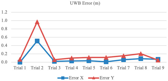 The average distance error measurements were 4 cm and 11 cm for the x and y coordinates, respectively, excluding the second trial at the (2,1) location. In the second trial, the distance error measurement was 0.97 m for the y coordinate and 0.51 m for the x coordinate. Several factors could have contributed to the distance error observed in the second trial, including the orientation of the anchor’s antennas, as suggested by Grasso et al. [22]. Their study found that positioning accuracy could be improved by directing the anchor’s antennas toward the center of the area being covered, resulting in distance errors of 5 cm for dynamic measurements and 15 cm for static measurements.