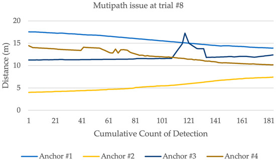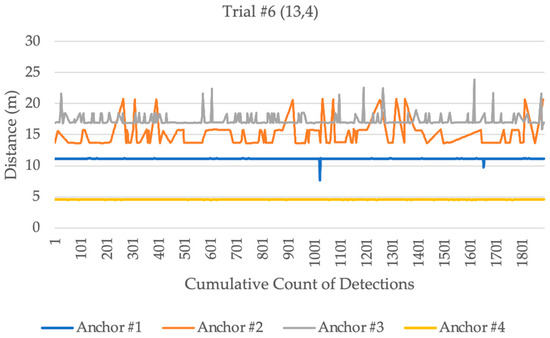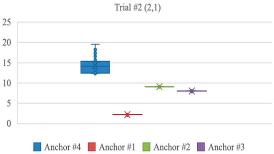 The distribution of distance measurements for trial 2 (2,1) is illustrated in Figure 7. It was observed that the anchor located at (10,10) provided a wide range of distance detections. Although the actual distance between this anchor and the stationary tag was 12.04 m, the distance measurement reached 19.54 m. This error in measurement could be attributed to the proximity between the tag and the anchor. It was observed that the error increased when the distance between the anchor and tag was more than 10 m.