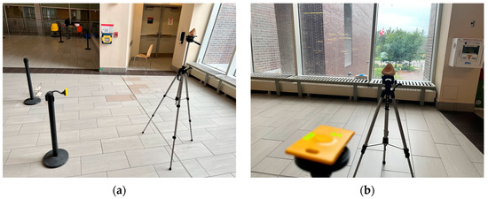 The first experiment was placing the anchor at 1.65 m height and the tag at 1 m. The experiment investigated two orientation scenarios, such as placing the tag horizontally and vertically, as shown in Figure 10. Then, the study looked into placing the anchor and the tag at the same height (1 m), as illustrated in Figure 10b.